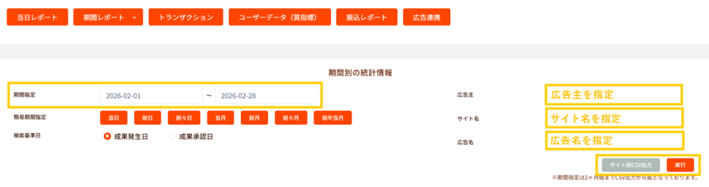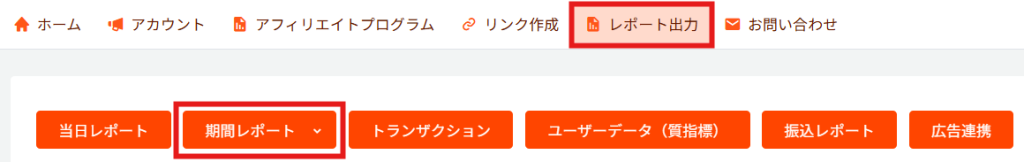 アフィリエイター様ログイン > 画面上部「レポート出力」> 「期間レポート」へ
