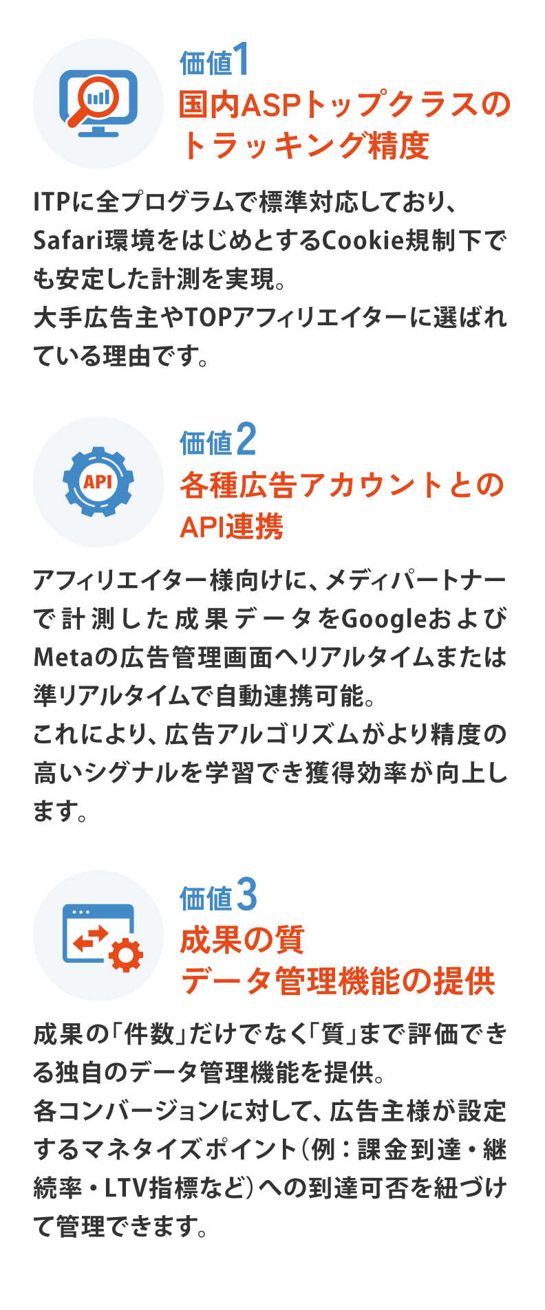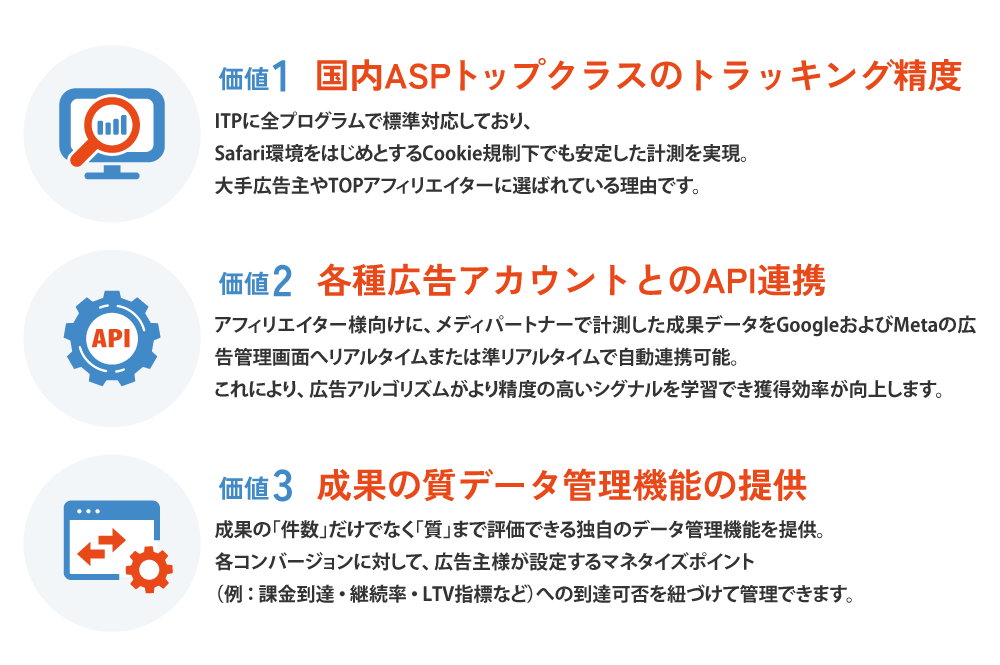- WEBコンバージョンの先にある転換率やLTVを広告主様と共に追いかけます。広告主様の実収益に繋がるアフィリエイトマーケティングを展開。